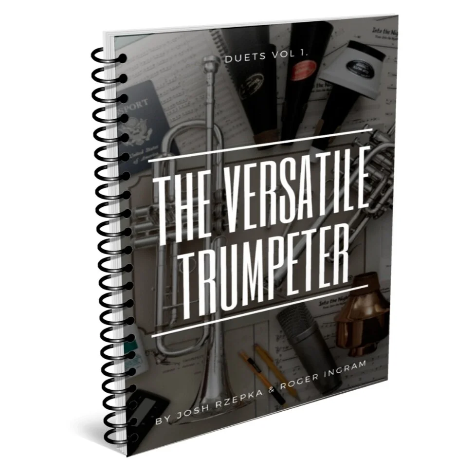 The Versatile Trumpeter: Duets Vol 1, published by One Two Tree publications, is geared towards taking you to new places and guiding you to success in new and exciting genres. Two years in the making, it was written by trumpeters Josh Rzepka and Roger Ingram. The book is 114 pages and includes 16 brand new duets, accompanying text, as well as play along tracks. The text discuses aspects such as: playing in different styles, mute technique, doubling with flugelhorn, as well as many more topics that you’ll encounter in the music world. The duets cover multiple styles, including swing, bebop, latin, and pop/rock.